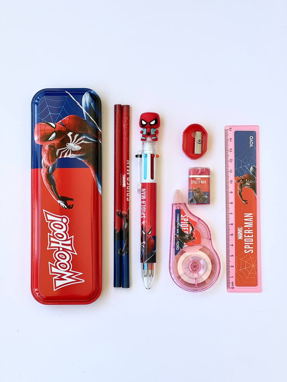 ست هشت تیکه لوازم تحریر مردعنکبوتی مناسب برای کودکان و نوجوانان میباشد. همچنین با بستهبندی باکیفیت و عالی گزینهای مناسب برای کادو میباشد. این ست شامل موارد زیر است: